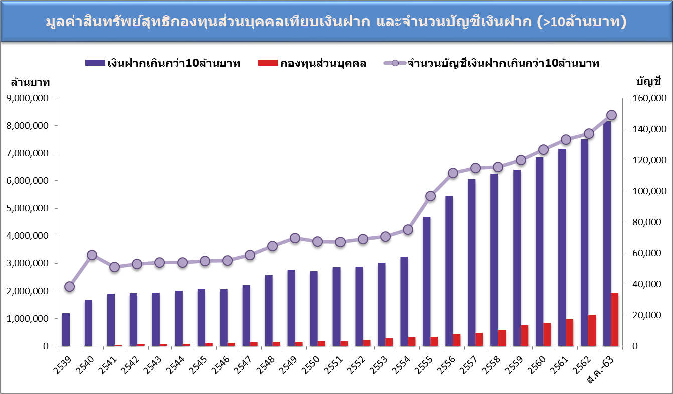 มูลค่าทรัพย์สินสุทธิของกองทุนส่วนบุคคลเทียบเงินฝาก-จำนวนบัญชีของผู้มีเงินฝากมากกว่า 10 ล้านบาท ปี 2539-2563