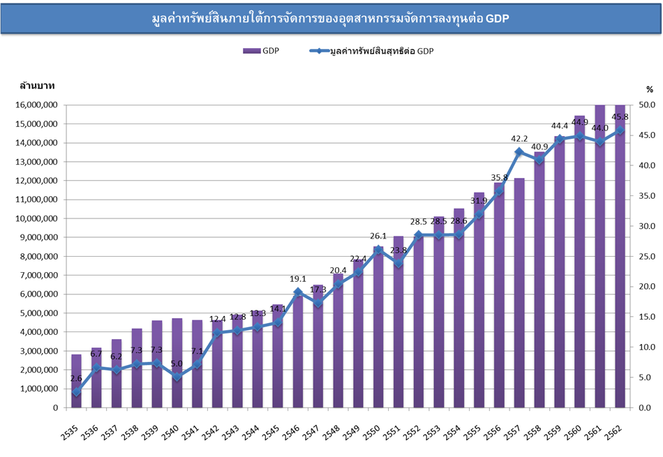 มูลค่าทรัพย์สินภายใต้การจัดการของอุตสาหกรรมจัดการลงทุนต่อผลิตภัณฑ์มวลรวมภายในประเทศ ปีพ.ศ. 2544-2562