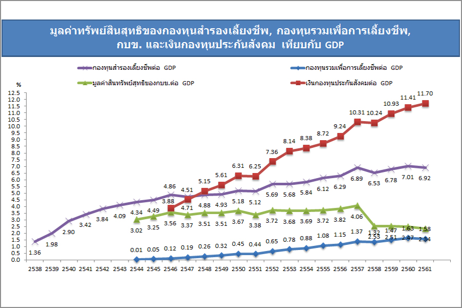 สัดส่วนมูลทรัพย์สินสุทธิกองทุนสำรองเลี้ยงชีพ, กองทุนรวมเพื่อการเลี้ยงชีพ, กบข. และเงินกองทุนประกันสังคม ต่อ GDP ปี 2538-2561
